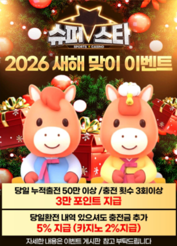 후기 분류 슈퍼스타 이번 달 이벤트 있음 작성자 정보 소미 작성 7 조회 0 추천 작성일 2026.01.14 14:04 본문 슈퍼스타에서 새해맞이 3만포인트 이벤트 쏩니다 슈퍼스타 자주 이용하는데 너무 믿음직해서 좋아요. 0 추천 관련자료 로그인한 회원만 댓글 등록이 가능합니다. 컨텐츠 정보 목록